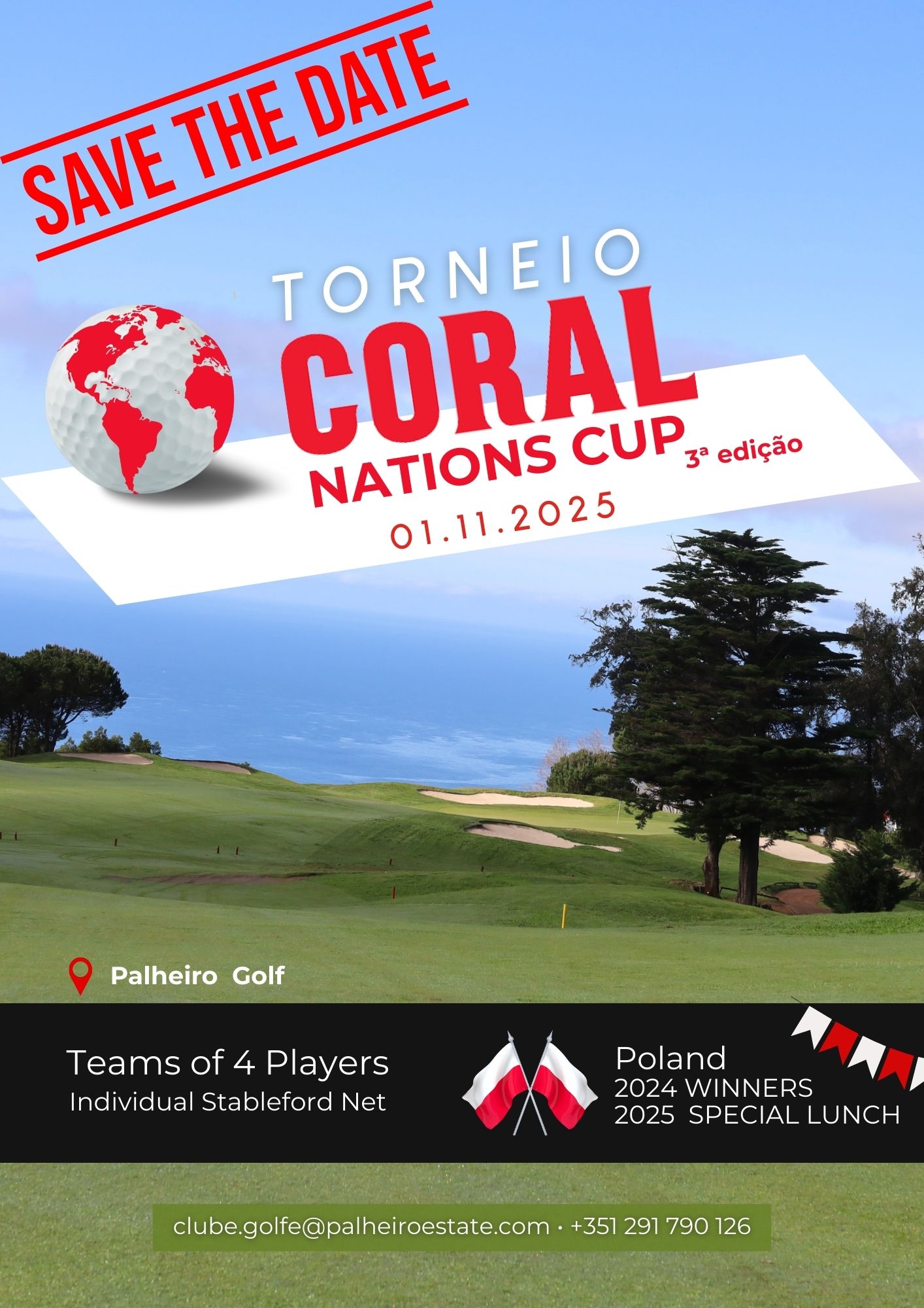 TORNEIO CORAL NATIONS CUP 2025 Data do Torneio:01 de Novembro 2025 Horário Início: Saidas em shot-gun às 08h30. Modalidade de jogo:EQUIPAS DE 4 JOGADORES, Stableford Net, 18 buracos. Prazo das inscrições e anulações: Até dia 27 de Outubro de 2025 E-mail: clube.golfe@palheiroestate.com Contacto telefónico+351 918 240 050 ou +351 291 790 126 (Chamada para rede fixa nacional). Este torneio é muito mais do que uma competição: é uma celebração da diversidade e do espírito internacional que caracteriza o nosso Clube. 👉 Como funciona: